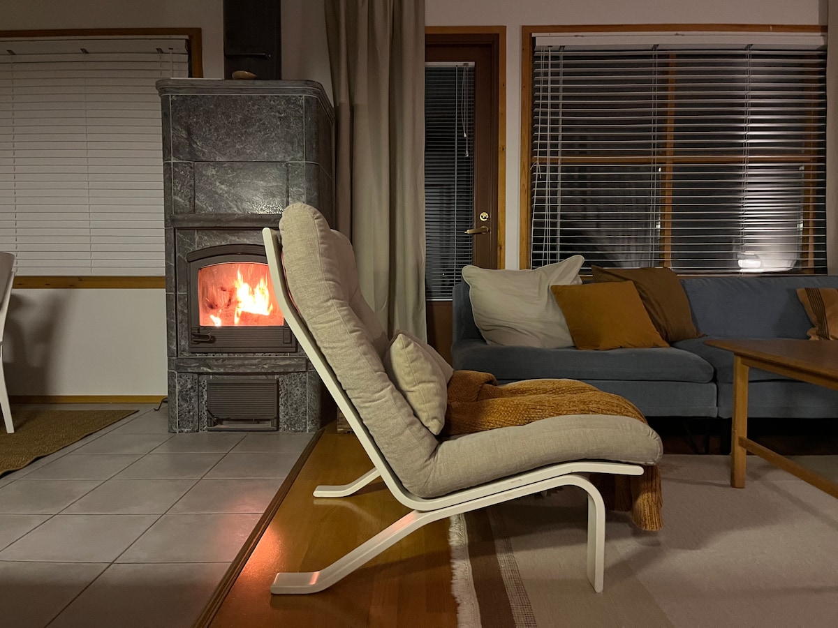 Maison mitoyenne triangulaire avec sauna à 2,8 km du centre de Kajaani. - dans la chambre principale, un lit double 160 x 200 dans une chambre plus petite, deux lits séparés 80x200 et un bureau - le salon dispose d'un canapé-lit pour deux 140 x 200 Cette maison offre tout ce dont vous avez besoin pour un séjour plus long. TV et chaînes câblées. Cafetière, bouilloire, micro-ondes, réfrigérateur et congélateur. Lave-linge et lave-vaisselle. Vous pouvez garer la voiture facilement juste devant l'appartement. S'il y a plus d'une voiture, il y a un parking derrière l'appartement