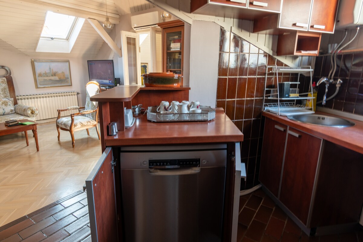 Apartment KLARA is a 90 m2 attic, only one on the last fifth flour with two bedrooms, large living room, open terraces with town view. Recently completely renovated, fully equipped /essentials, iron, wireless internet, cable TV. Very quite, with two bedrooms, one of them is an suite, two bathrooms, large living room with kitchen. Just like true home where from you can easily reach all Belgrade's places of interest. Host is on disposal for any kind of assistance. .