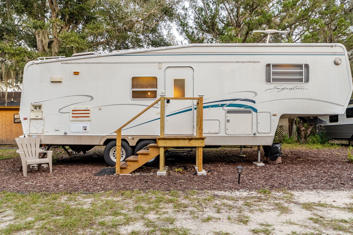 Une caravane de voyage moderne et confortable nichée au milieu de chênes dans notre jardin. Le quartier calme est à quelques minutes du centre-ville et du campus de l'UF. Le camping-car de 19 pieds dispose d'un lit Queen Size confortable, d'une cuisinière, d'un four à micro-ondes, d'un réfrigérateur et d'une cafetière. Douche et toilettes séparées. Idéal pour un voyageur en solo ou un couple actif. Offre spéciale : 15 % de réduction pour les séjours à la semaine et 30 % pour les séjours au mois. Fait amusant : nous sommes dans la même rue que Tom Petty a grandi, à deux pas du parc Tom Petty récemment rebaptisé.