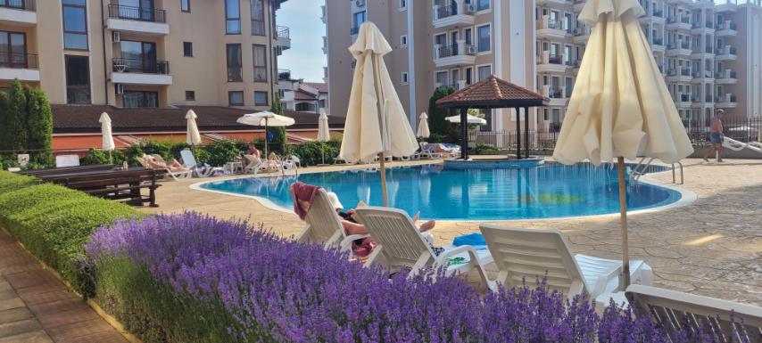 Просторный апартамент с одной спальней и гостиной и прекрасной мебелью.К услугам гостей комплекса предоставляется бассейн, большой и красивый сад для прогулок, ресторан турецкой кухни, магазин, пиано-бар, СПА, кабельное телевидение, паркинг, wi-fi. Зонтики и лежаки на бассейне бесплатно. По запросу будет организована детская кроватка. Комплекс расположен в спокойной части Святого Власа, до Марины Диневы-1км.
