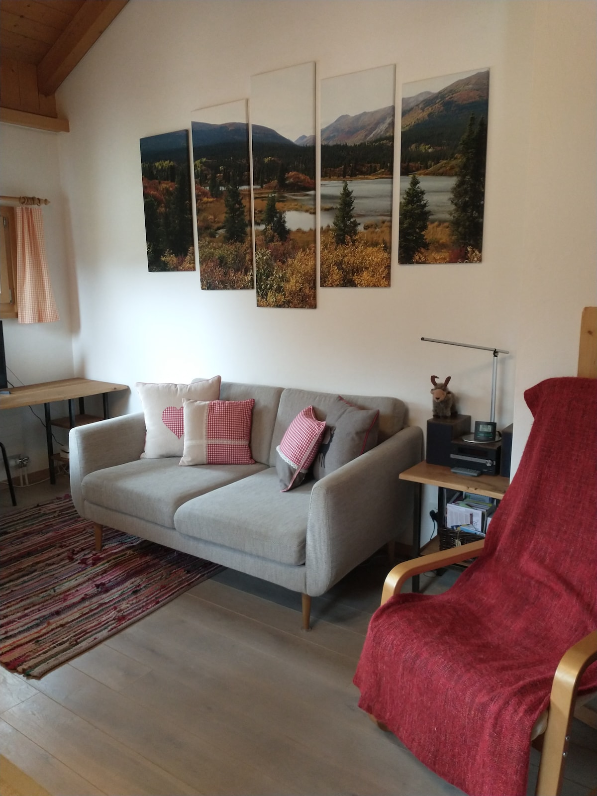 Appartement central de 3.5 pièces. Commerces et bureau de poste ne sont que Vis-a-Vis de l'appartement. L'appartement dispose de deux chambres ainsi que d'un salon. Dans le salon, il y a aussi deux couchages. Une chambre dispose d'un lit cabane, pour cette raison, seuls cinq lits sont indiqués. Mais l'appartement dispose de six couchages. La cuisine est spacieuse.