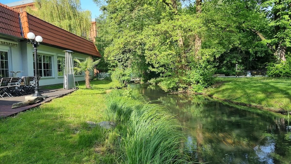 Si tu veux vivre dans la verdure et pourtant dans la vieille ville d'Eberswalde, alors viens chez nous. Avec vue sur le parc et la petite rivière. La chambre spacieuse d'environ 45 m2 se trouve dans l'annexe et dispose d'un accès séparé. Un lit double et un canapé-lit pour un maximum de 3 personnes, y compris douche, WC Pas de possibilité de cuisiner mais un café &restaurant à côté Cette chambre de vacances située au centre dispose d'une terrasse privée avec vue sur le parc et la petite rivière. Ici, tu peux te relaxer et te détendre