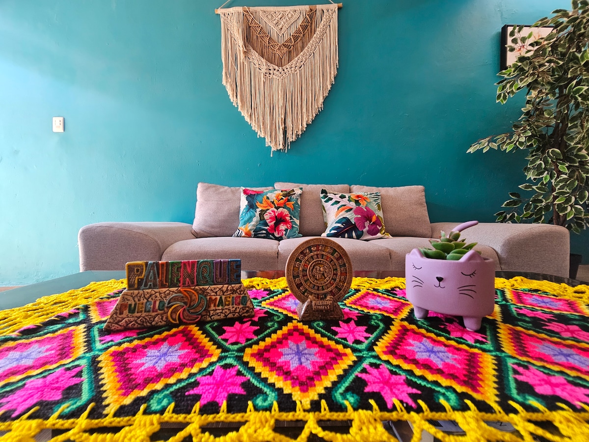 Loma 369 est un appartement situé à seulement 3 minutes de la zone archéologique et à seulement 25 minutes des cascades de Roberto Barrios et à une heure d'Agua Azul. Avec ses grands espaces et sa belle terrasse rendront votre visite agréable . Si vous avez un peu de chance, vous pourrez profiter des Singes hurleurs et les aras. Si vous appréciez les randonnées en plein air ou le VTT, ce sera votre endroit idéal !