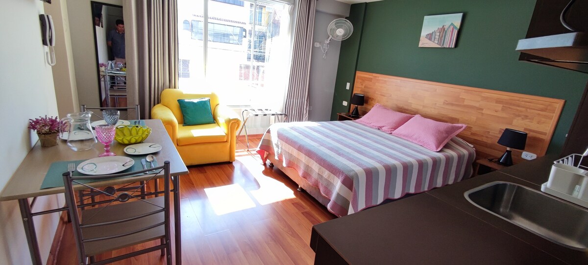 STUDIO CENTRAL ET CONFORTABLE DE 25 m2, AVEC UN NETTOYAGE SOIGNÉ, très proche des commerces et des lieux d'intérêt, confortablement meublé, dispose d'une kitchenette équipée, d'un réfrigérateur, d'une table à manger, d'un lit Queen, d'une télévision 43" avec chaînes câblées, d'une salle de bain privée équipée d'une coiffeuse et d'une douche avec hydromassage. Il dispose également d'un balcon et d'une excellente vue sur la ville, d'une buanderie et d'un séchoir à linge, d'une armoire, du WIFI, d'un coffre-fort. Propriété située au cinquième étage, avec accès indépendant uniquement par des escaliers.