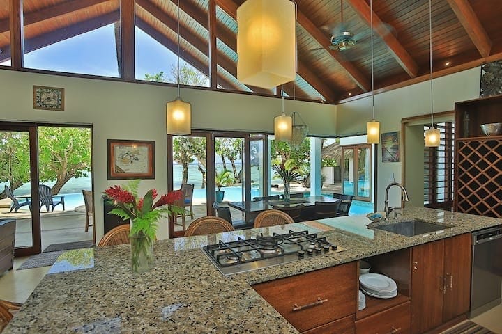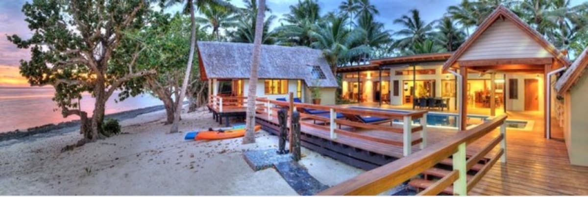 Luxe tropical en bord de mer aux Fidji, découvrez votre propre villa privée exclusive avec des amis et des groupes familiaux élargis. Cette villa de 5 chambres comprend 4 chambres avec lit King Size et une chambre avec lits superposés pour enfants, avec une cuisine entièrement équipée et une piscine en bord de mer. Cette villa est entièrement équipée avec des hôtes, du personnel de ménage et des activités. Également disponible : notre service de chef cuisinier tout compris, une masseuse et une connexion Wi-Fi gratuite.