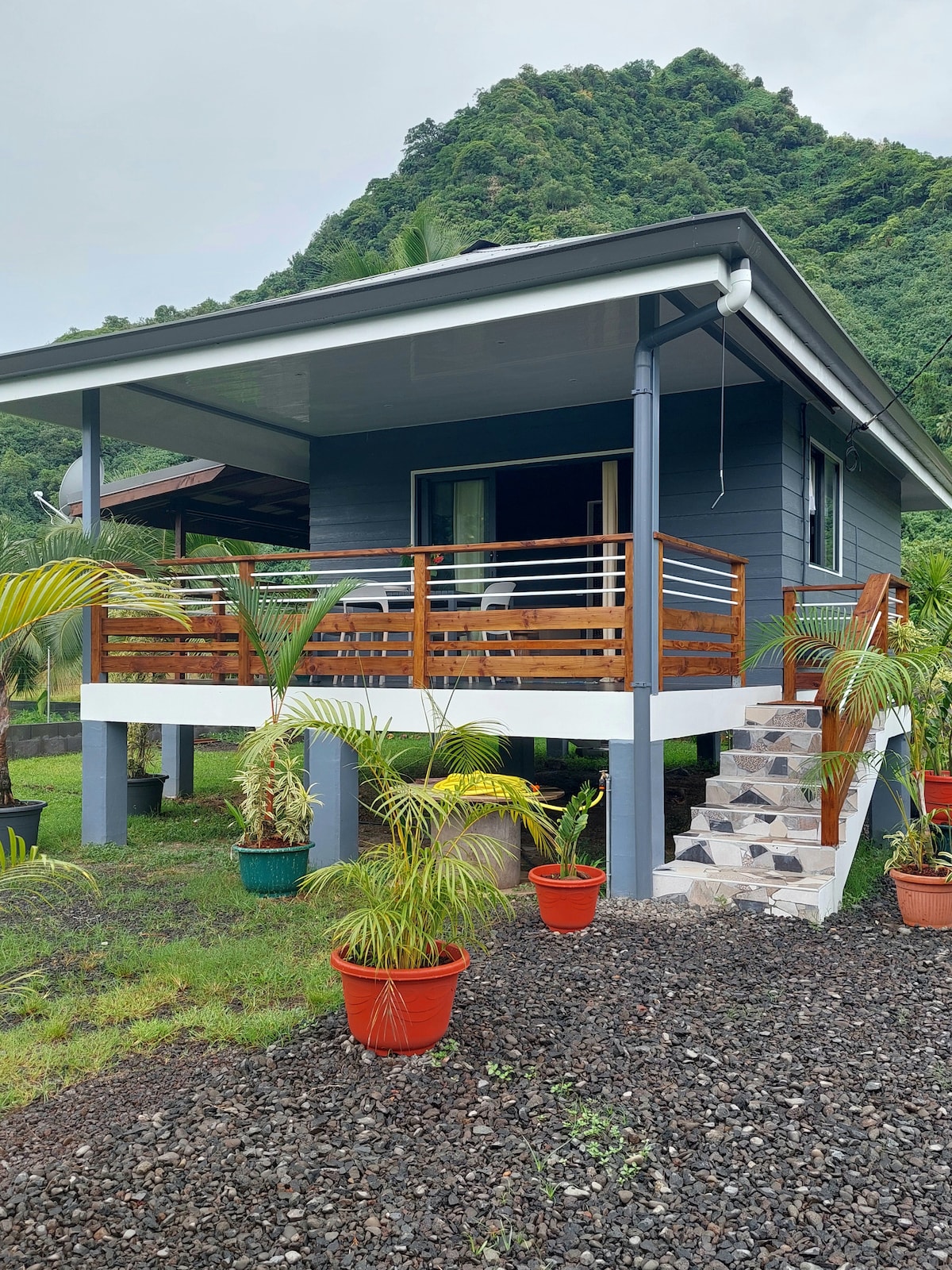 Détendez-vous dans ce cottage tropical, en montagne, à 500 m d'altitude, à 30 mn de l'aéroport, avec une vue unique à Tahiti sur le lagon et Moorea, dans une résidence très calme 2 chambres climatisées, avec 2 télévisons, internet, pour 5 personnes avec soit 2 lits king size et 1 lit simple ou 1 king size et 3 lits simples. Deck, piscine, BBQ Cuisine avec lave vaisselle, micro-onde, bar, four, cuisinière à gaz 1 Salle de bain, sèche cheveux, lave linge+sèche linge, fer à repasser