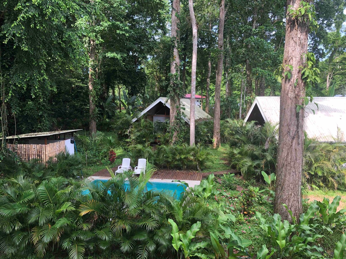 Magnifique bungalow écologique 2 personnes avec terrasse, hamac, wifi, climatiseur, eau chaude et cuisine entièrement équipée dans une petite propriété avec piscine à l'intérieur d'un jardin tropical luxuriant. *À 5 minutes à pied de la plage de Playa Chiquita et à 12 minutes en voiture du centre-ville de Puerto Viejo. * Stationnement ombragé plus deux ports de recharge pour les véhicules électriques sur la propriété (220 et 110 V) !