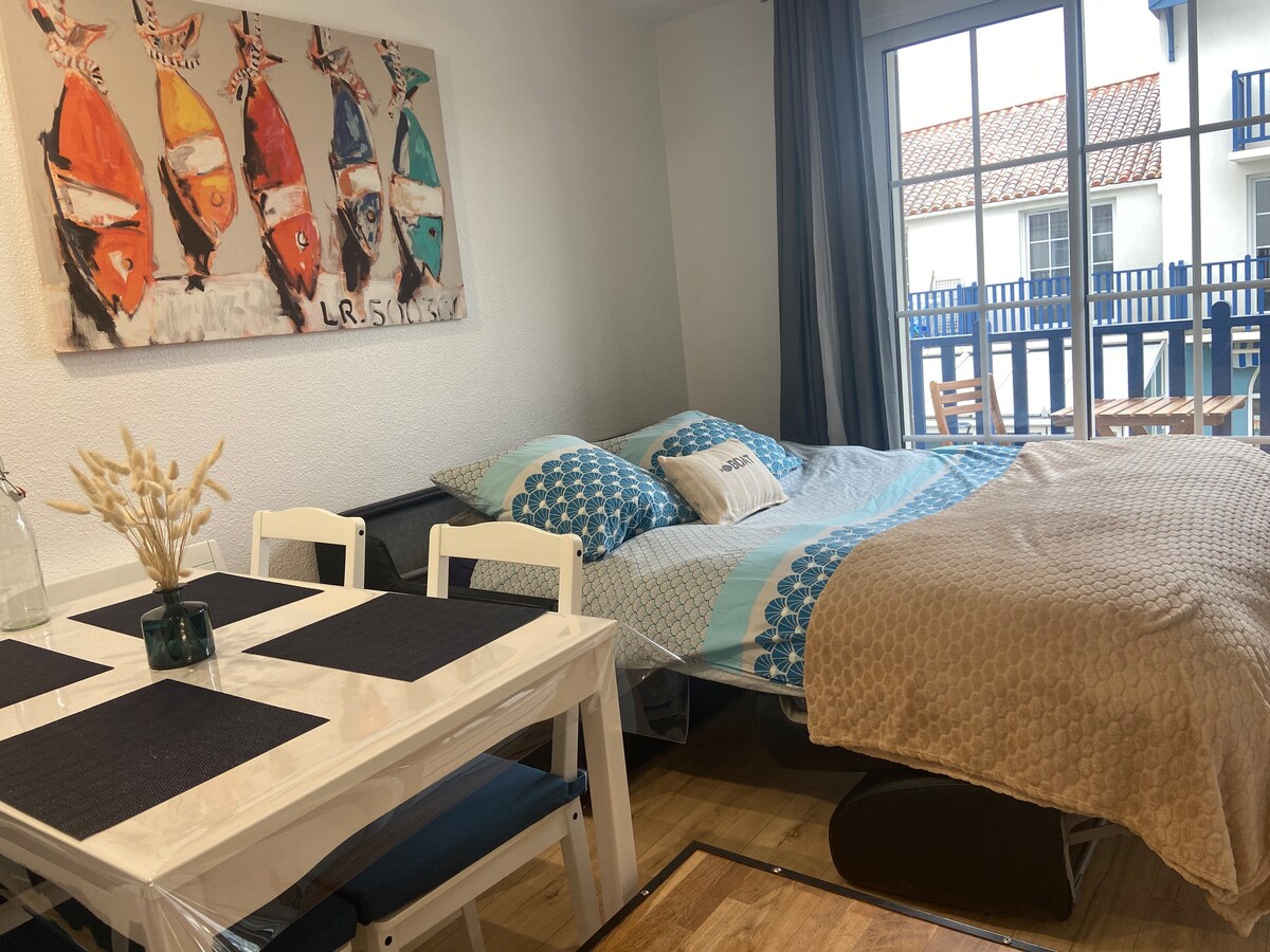Au calme d'une impasse, vous entendrez au loin, la mer. Studio de 17m2, situé au cœur du village, à 20 mn des Sables d'Olonne. Le studio comprend: -lit 140X190(draps non fournis) -couchage en mezzanine, pour enfant à partir de 6ans:lit 90X190(draps non fournis) A disposition: couettes, oreillers -kitchenette (plaque, réfrigérateur, micro-ondes, cafetière, bouilloire…) -douche de 70X70, passage étroit pour entrer dans la douche(30cm)+WC -terrasse avec table et chaises -Parking communal à 100m