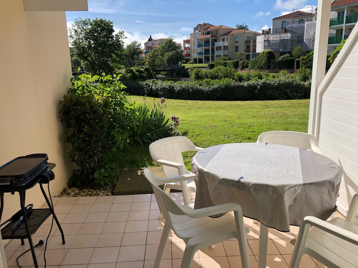 🌟Vous apprécierez sa magnifique vue sur le Lac et jardin, sa proximité de la plage du Veillon et du golf.🌟 Appart lumineux , chambre séparée avec 1 grand lit, WIFI, situé au 1er étage avec balcon et terrasse. 🌊💫ACCÈS gratuit piscine centrale avec bracelet L'espace aquatique du village (avec les toboggans) sera ouvert aux résidents et vacanciers Fin Avril au 12 sept. - 🏖️Plage du Veillon 1 km5 à pied p/chemin ou à vélo. - 🅿️Parking gratuit au pied de la rés. + parcs à vélos