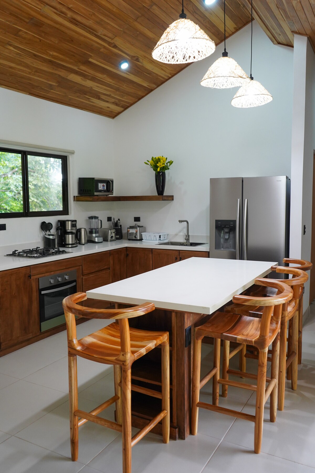 Villa el Mango is a modern luxury villa in the north of Santa Teresa beach, Costa Rica. This spectacular three-level luxury villa was completed in April 2021. It is built on a steep hill in a safe neighborhood (4x4 need we). It has a guard who lives on the property and provides extra night security. Among all the trees and plants, the villa is built on beautiful mango trees which surrounds the villa and gives it the name "Villa el Mango".