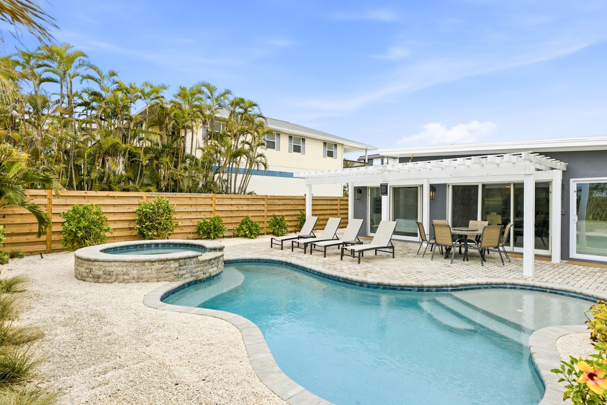 Évadez-vous dans notre oasis en bord de mer sur l'île Anna Maria ! Cette maison lumineuse et rénovée dispose d'une piscine privée chauffée, d'un jacuzzi et d'un quai. Parfait pour les familles, il se trouve à seulement 5 minutes à pied des plages de renommée mondiale du Golfe. Profitez de superbes levers de soleil, d'un espace de travail dédié et d'un décor côtier moderne. Explorez l'île en toute simplicité grâce au trolley gratuit. Votre escapade parfaite vous attend !