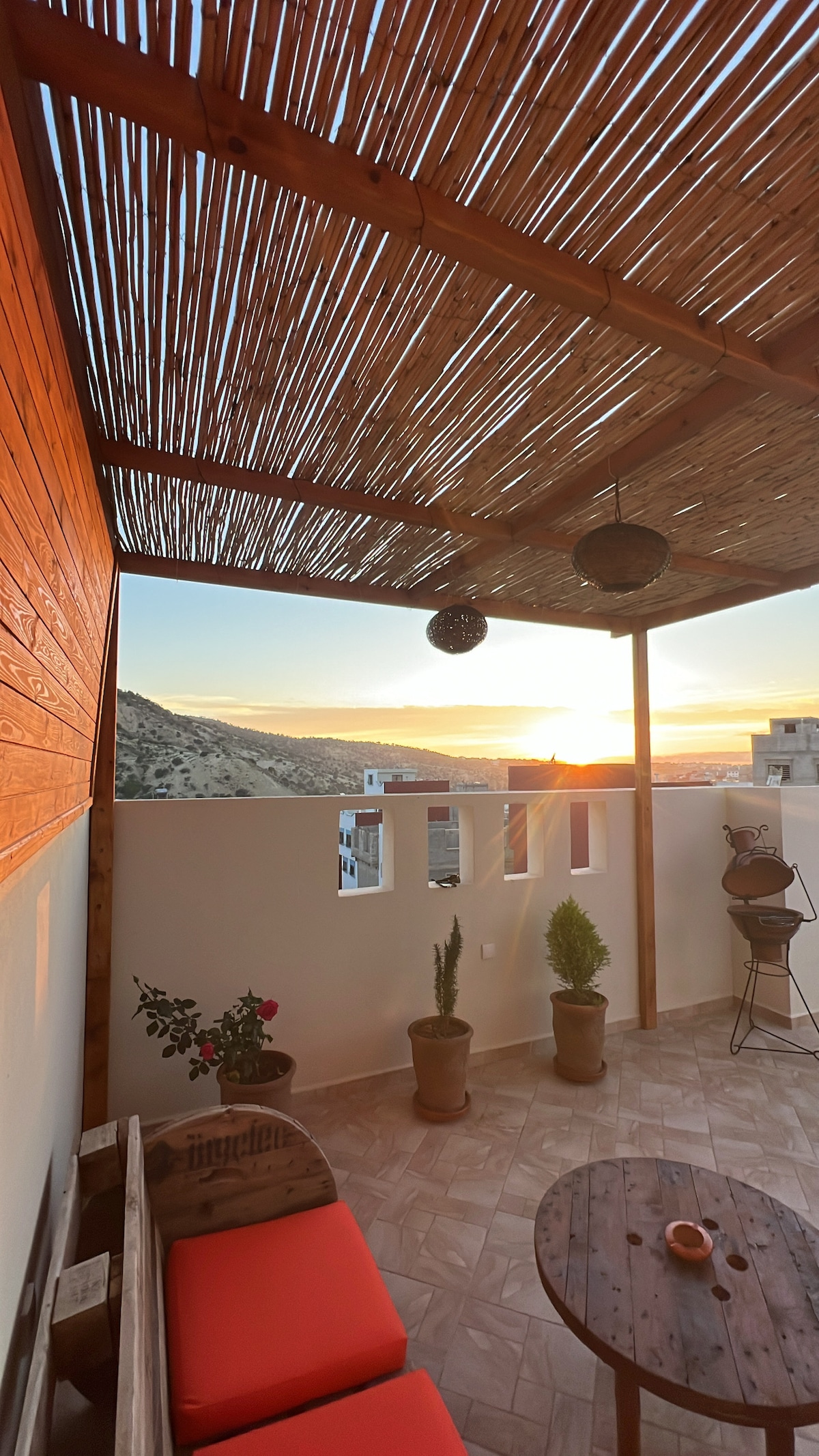 Notre hébergement est situé à Tamraght, à 16 minutes à pied de la plage de Taghazout. L'appartement est équipé de deux chambres, d'une cuisine, d'une salle de bains et d'un balcon avec vue sur la mer. L'appartement est situé au troisième étage de notre maison d'hôtes et est idéal pour les groupes et les familles. Vous aurez également accès à une terrasse commune avec une vue splendide sur la ville et la mer.