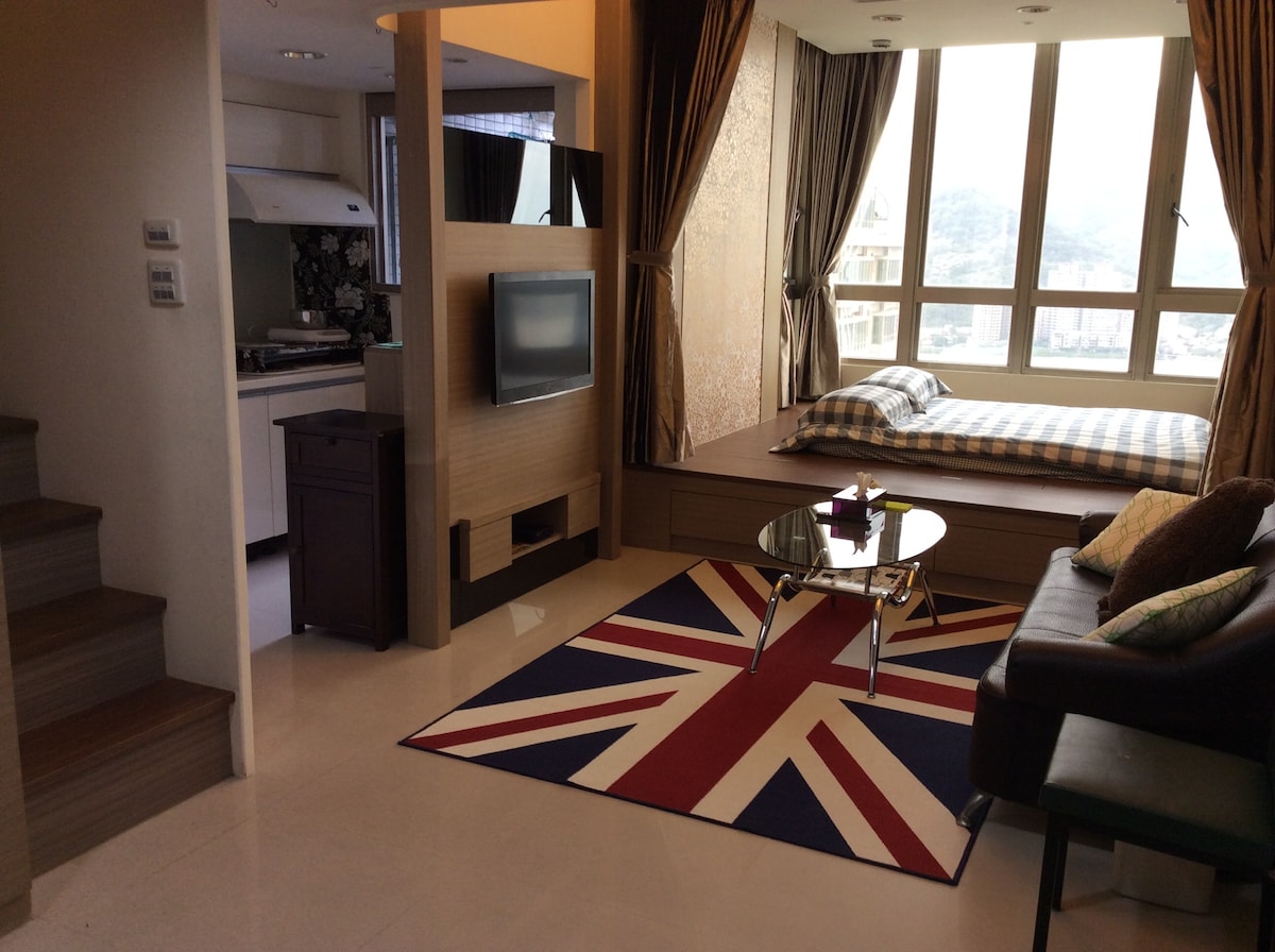 Un bel appartement-studio en étage élevé avec arrivée autonome à Tamsui Taipei. Convient aux voyageurs de longue durée. Accès Wi-Fi gratuit. Tout votre espace personnel. Vous pouvez cuisiner et laver vos vêtements à l'appartement. Il y a également un centre de fitness et une piscine extérieure (heure d'été limitée : juin à septembre).