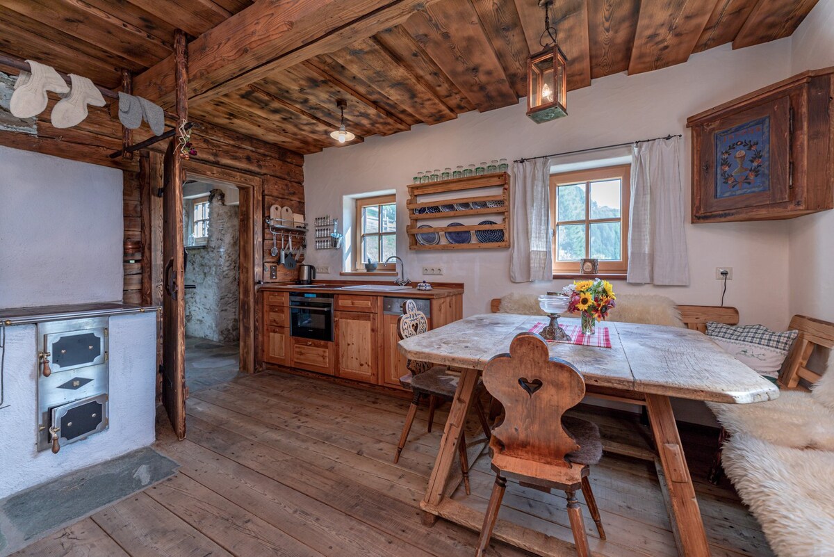 Dein erster Blick früh morgens sucht sich den Weg durch die ehemalige Stadlbrücke des Peitler Chalets und trifft auf das beeindruckende Massiv vom Reitereck. Barfuß gehst über den naturbelassenen, geölten Zirbenboden. Der Duft des Holzes erfüllt die ganze Almhütte. Du spürst: Hier kannst du dich im Urlaub so richtig entspannen.