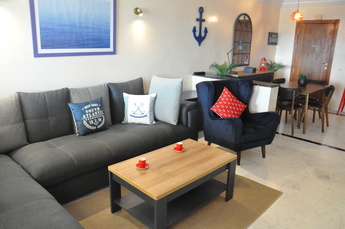 Vous êtes à la recherche d'un appartement moins cher qu'un hôtel. Découvrez cet appartement luxueux en plein centre-ville de Tanger et avec vue partielle sur mer, à 2 min de Marina ,près des cafés et boutiques ,du Mall Ibn Batouta ,de l'ancienne médina et monuments historiques .Le point de départ idéal pour explorer la ville. Cet élégant appartement d'une chambre, un salon ,une terrasse vue mer ,une cuisine américaine , un climatiseur , une WIFI , ( espace de travail ) , smart TV .