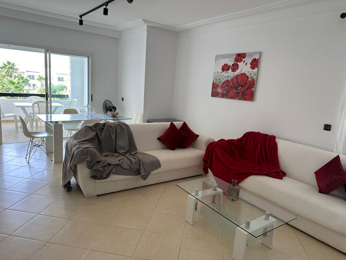 L'appartement se compose de 2 chambres proche de tous les sites et commodités. - à 3 min à pied de la plage. - à 1 minute à pied du la corniche. -10 min à pieds de la gare TGV et City Mall Tanger. -L'immeuble est sécurisé 24/24(camera à l’entrée et concierge) . - Parking gratuit disponible sur place. - La piscine à l'extérieure de l'immeuble 5min à pieds. - La piscine est ouverte Juillet et Août. - Piscine accessible à tous. Baignade gratuite pour 4 pers, puis 40 DH/pers suppl.