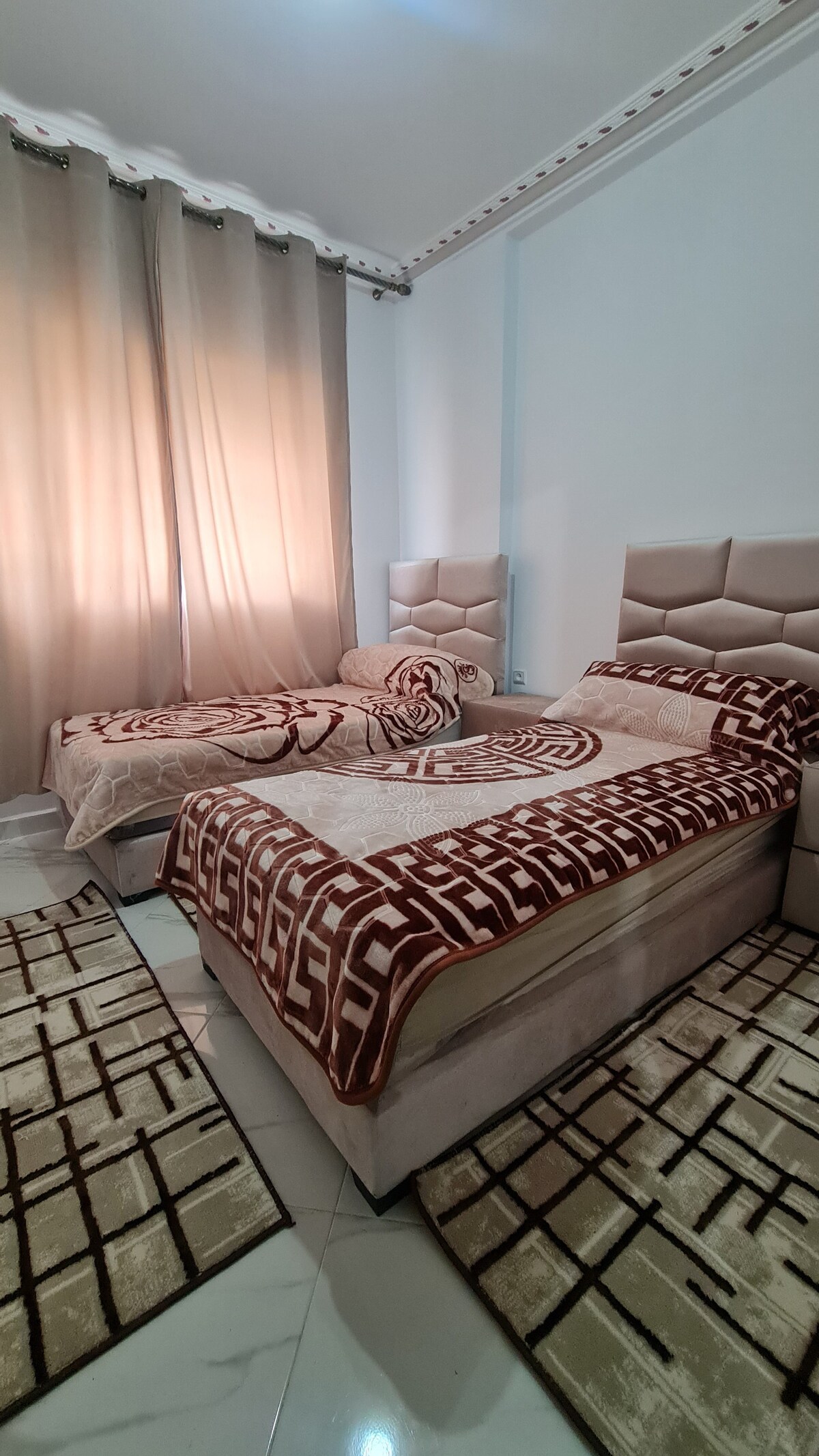 Découvrez notre magnifique appartement neuf à Tanger avec vue sur la mer. Ce logement moderne comprend deux chambres, chacune avec un balcon, deux toilettes , et un grand salon avec un écran de 75 pouces et Netflix. La cuisine est entièrement équipée. Situé à proximité de toutes les commodités, y compris un grand mall, vous n'aurez pas besoin de voiture. La plage est à une minute à pied et un garage souterrain gratuit est disponible avec accès facil. Profitez d'un séjour confortable et relaxant