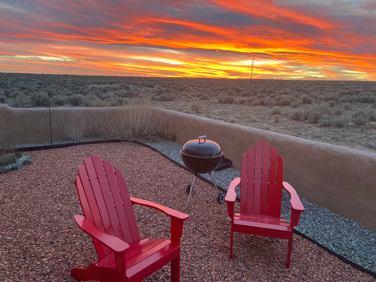 Notre maison organique moderne est un nid confortable, construit par un artisan, qui offre à ses visiteurs lumière, espace ouvert et couleur. Elle dispose d'un cadre calme et privé avec tout le nécessaire pour rendre votre séjour confortable et, espérons-le, inspiré. L'extérieur est l'autre moitié de cette maison, créant un amphithéâtre enveloppant de jardins, d'oiseaux, d'arbres et d'un hamac. Au-delà de ce nid privé, il y a une vue à 360 degrés sur les montagnes Sangre de Christo, la gorge Rio Grande, des couchers de soleil spectaculaires et des kilomètres de sentiers pédestres et cyclables.