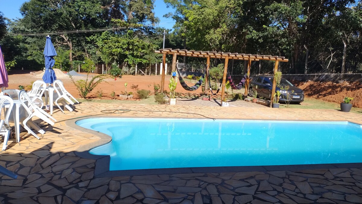 Charmante maison de campagne dans un condominium fermé où les oiseaux chantent dans le verger à l'aube. C'est l'endroit pour une baignade rafraîchissante et un soleil levant éclatant. Détendez-vous avec toute la famille dans ce logement paisible. Excellent emplacement, à environ 55 km de Belo Horizonte (3 km avant Jaboticatubas, autoroute MG-020).