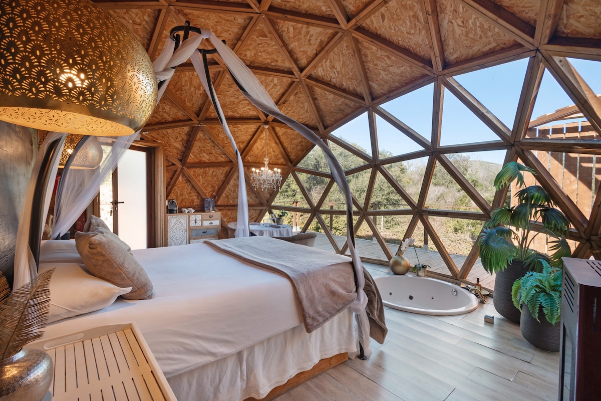Vous recherchez la paix et le calme, une intimité totale, une belle nature et des paysages avec une vue à 360 degrés sur les montagnes et les vallées ainsi qu'une touche de classe ? Eh bien, c'est l'endroit idéal pour vous ! Le dôme dispose d'un lit queen, d'une cuisine équipée avec des produits de base pour le garde-manger, d'une table à manger, d'un ventilateur extracteur solaire automatique et d'un salon avec poêle à bois. Il dispose d'un joli jardin privé, d'une piscine à effet pluie, d'un barbecue au gaz et au charbon de bois, d'un poêle à paella, d'un dîner extérieur ombragé et d'un terrain de bowling pour de nombreux jeux.
