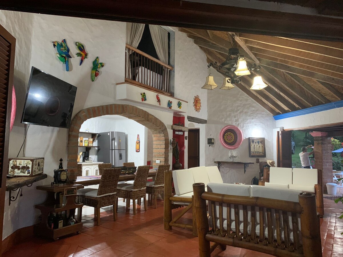 Détendez-vous avec toute la famille dans ce lieu calme, sûr et très agréable. À 3 minutes de BOLOMBOLO À 1 h 20 de Medellín Maison très spacieuse, avec de bonnes chambres et salles de bains, avec sa propre forêt, observation des oiseaux, beaux jardins, piscine, kiosque, eau chaude, très propre. Excellent service. Il y a un supplément par nuit et par personne supplémentaire pour les 14 personnes, avec une capacité maximale de 20 personnes. Coût de l'employée par jour 80 000 $.