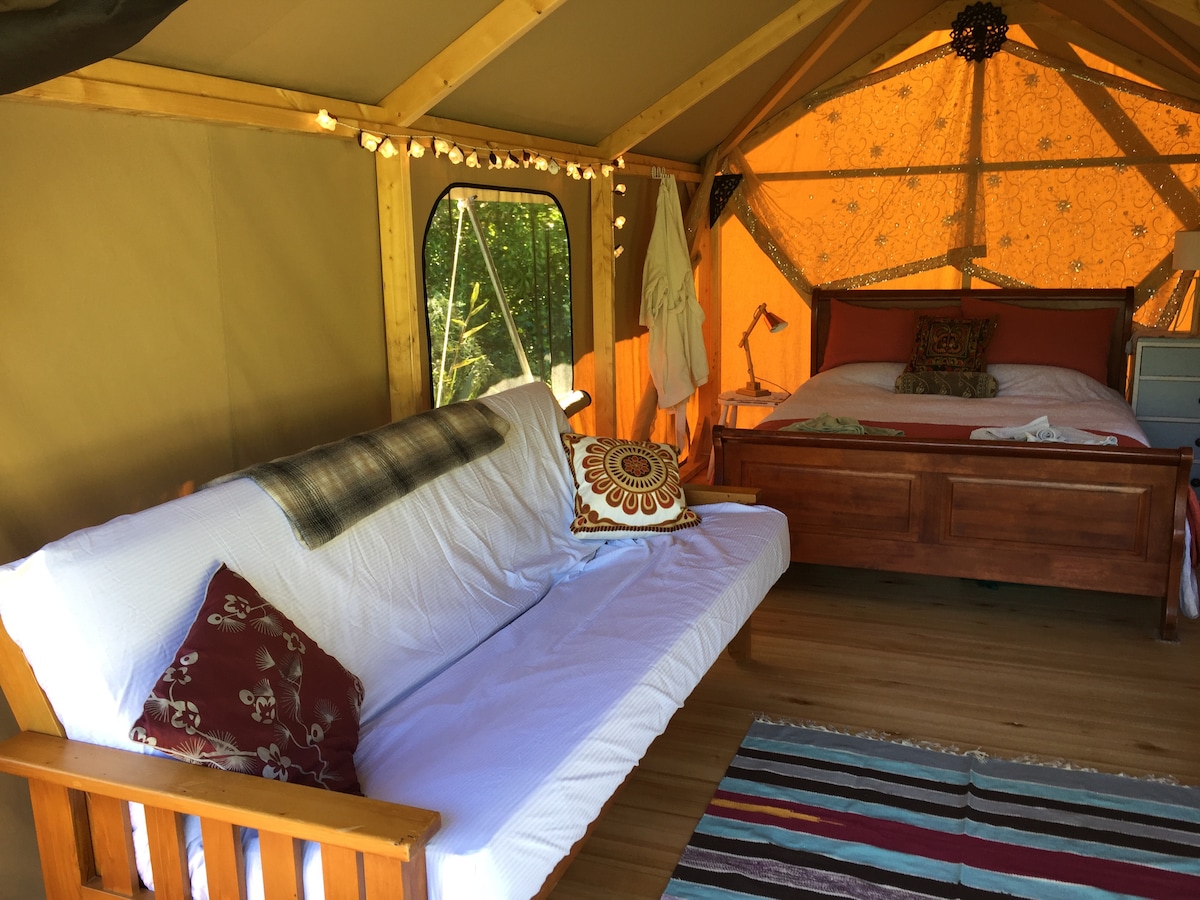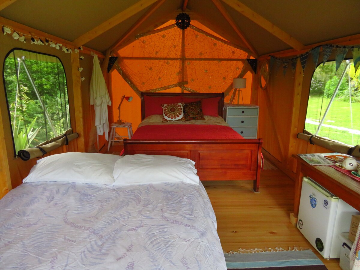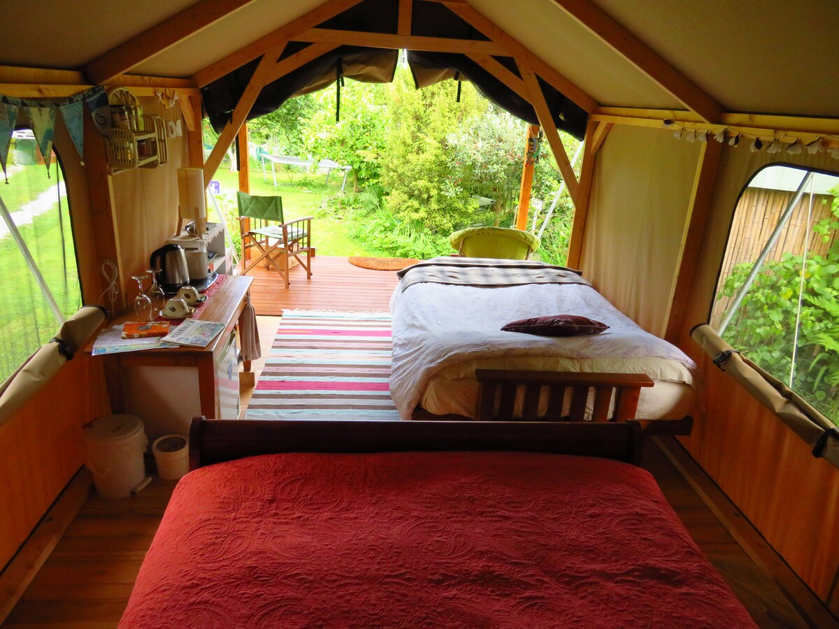Glamping (camping de luxe) dans un jardin de permaculture abondant avec plus de 50 arbres fruitiers et à noix. Profitez d'une tente privée et paisible sur ossature bois avec un lit Queen Size confortable parmi les jardins, les fleurs, les arbres, les oiseaux indigènes et les poules. Vous vous détendrez dans votre propre zone autonome dans un environnement luxuriant juste à côté de notre ruisseau. Une seule tente sur la propriété. Laissez la nature vous enlacer ! Nous sommes à 600 mètres de la plage avec les parcs nationaux de Kahurangi et d'Abel Tasman à votre porte pour l'exploration.