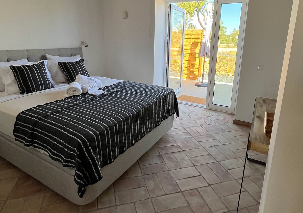 Grande Suite au calme avec lit Queen size+salle de douche+WC privés au REZ-DE-CHAUSSÉ. Lit parapluie + chaise haute BB sur demande. Lit supplém. jusqu'à 15 ans 70x190 dans la même chambre Grande terrasse privée avec transats, tables et chaises Vue sur jardin et vallée. Idéalement située pour découvrir endroits typiques de l'Algarve, Voiture OBLIGATOIRE pour déplacements. (Voir aussi sur Rés. Soc. pour d'autres photos) PAS DE POSSIBILITÉ DE CUISINER sur place. #moto #motards bienvenus.