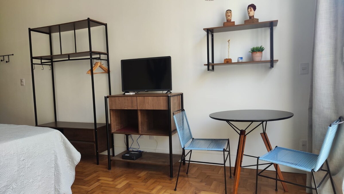 Studio Moderne Complet À seulement 2 pâtés de maisons du Shopping Frei Caneca et à 500 mètres de la station Mackenzie-Higienópolis, ce studio offre confort et praticité. • Climatisation • Wi-Fi 250mb • Smart TV • Lave-linge séchant (utilisation gratuite) • Bureau et chaise confortable • Serviettes et linge de lit inclus • Cuisine complète : micro-ondes, cafetière, four et cuisinière • Fer à repasser et sèche-cheveux Idéal pour des séjours courts ou longs, à proximité de l'Avenida Paulista.