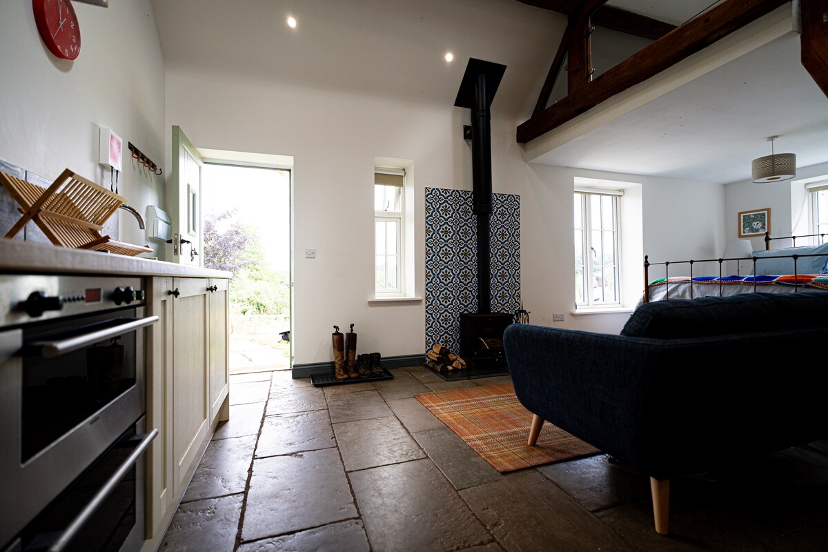 The Barn at Lees Farm est nichée dans le site du patrimoine mondial des gorges d'Ironbridge. Cette yourte doublée de feutre fabriquée localement vous offre un espace généreux avec un lit double en fonte. Chauffée par un poêle à bois, ce qui la rend charmante et confortable. La yourte est hors réseau afin que vous puissiez vraiment profiter de la détente, à l'intérieur et à l'extérieur, tout en bénéficiant du confort de la maison. Cuisinez à l'extérieur en utilisant le foyer/four à pizza ou à l'intérieur sur le poêle à bois ou la cuisinière de camping. Chiens acceptés. Jacuzzi au feu de bois (EN SUPPLÉMENT). Foyer. Guirlandes lumineuses, couvertures et nature.