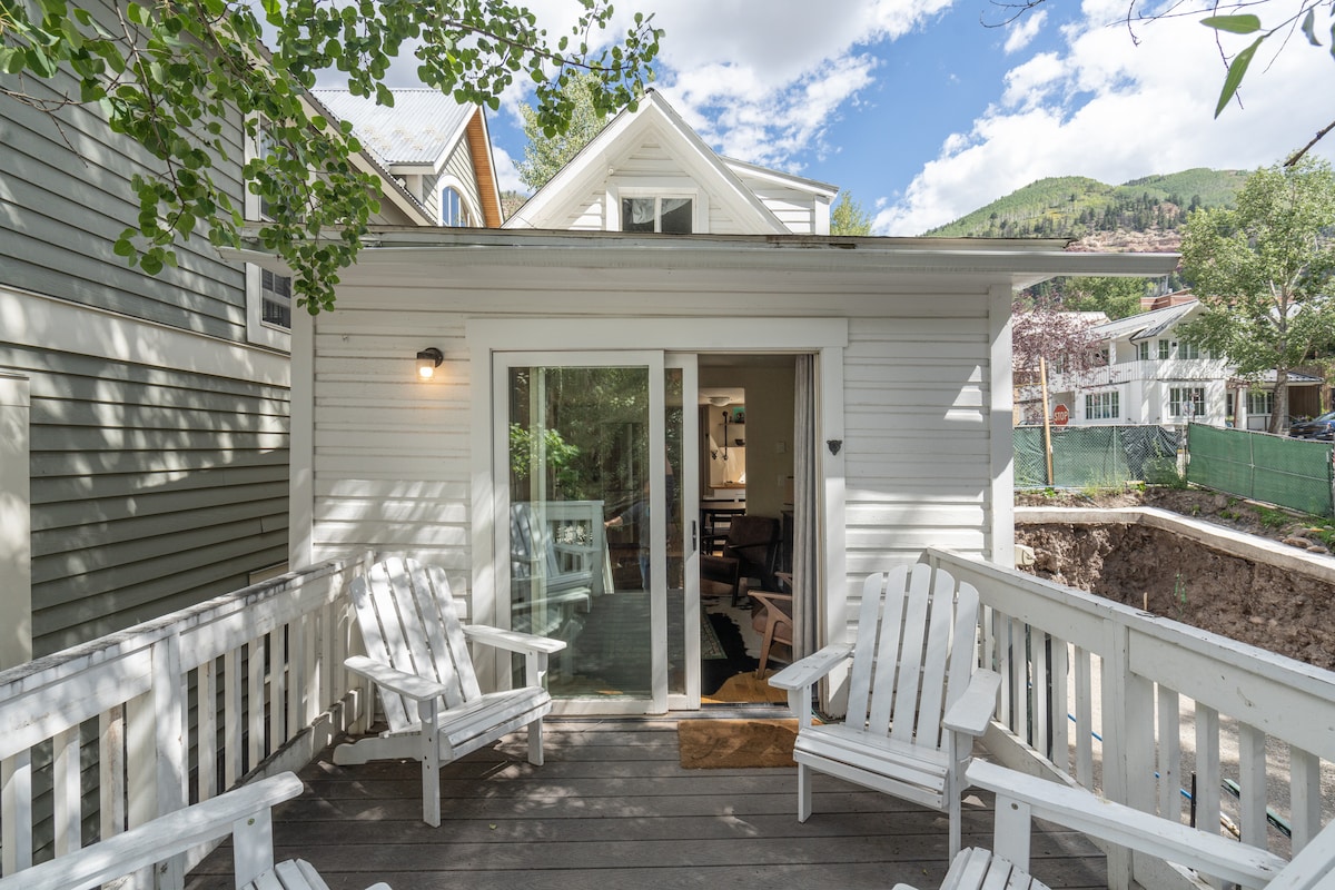 2022. Décorations légèrement différentes des photos. Studio lumineux et rénové, dans le quartier historique de Telluride, à 1 pâté de maisons de la rue principale de Telluride, pour les restaurants, la vie nocturne et le shopping. Les vues à l'est sont spectaculaires sur les sommets environnants. Le bâtiment historique peut affecter les personnes sensibles au bruit. À quelques minutes à pied des festivals de musique et de la télécabine. La ligne de bus circulaire locale gratuite se trouve également à 1 pâté de maisons de la porte. La carte de stationnement est fournie avec l'appartement. N° de licence commerciale - 142