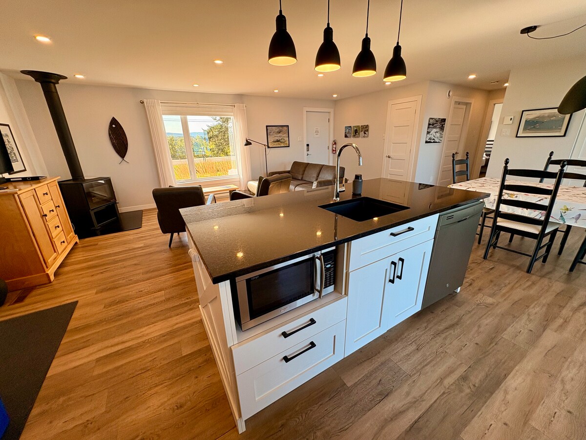 Fjord Appartement familiale 4 à 8 personnes Ce magnifique appartement qui surplombe le fjord peut accueillir plusieurs personnes, trois chambres séparées dont un lit king, deux grand lit Queen et canapé lit au salon, télévision, WI-FI. Cuisine complète avec lave-vaisselle, salle de bain avec double éviers, grande douche multijet. Profitez d’une magnifique terrasse privée , une aire de BBQ et un espace feu sur le terrain.Vue sur l’îlet, les montagnes le quai et de la marina.