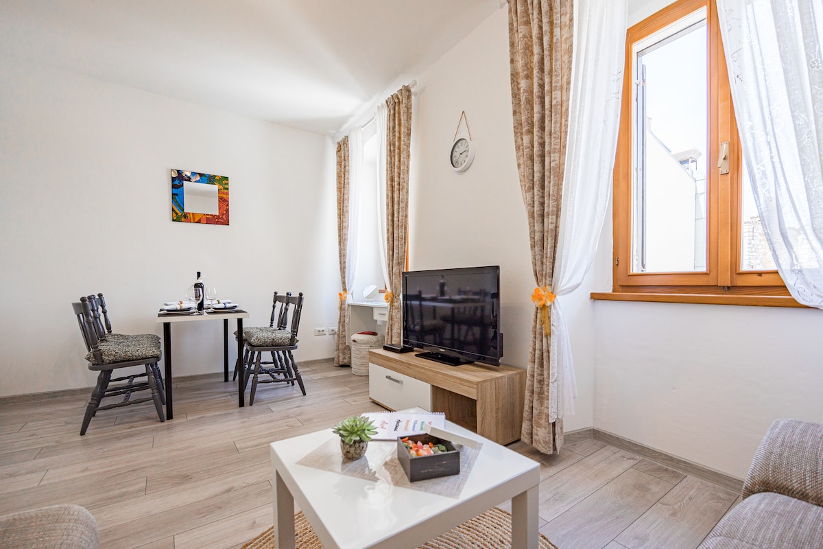 Fabuleux appartement spacieux (60 m2 pour seulement 2 personnes !) avec vue directe sur l'amphithéâtre et la mer depuis le salon et la chambre + une grande terrasse pleine de plantes. Une grande chambre avec lit double, salon, cuisine et salle à manger, terrasse verte spacieuse. WiFi gratuit, climatisation. Premier étage. PARKING à bon prix, à 3 min à pied de l'application. Emplacement juste à côté de l'amphithéâtre, vous serez au centre de l'ambiance de la vieille ville. À deux pas, vous trouverez de nombreux restaurants et cafés.