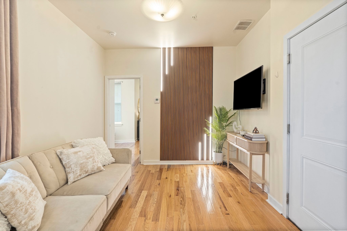 Appartement moderne de 2 chambres/2 salles de bain au cœur de Philadelphie avec accès au toit et patio. Profitez d'un espace de vie ouvert lumineux, d'une cuisine entièrement équipée et de deux chambres confortables avec beaucoup de rangement. À quelques minutes des cafés, des restaurants et des attractions telles que le Reading Terminal Market et la Liberty Bell. Parfait pour les couples, les amis ou les voyageurs d'affaires avec WiFi, télévision connectée et arrivée autonome facile.