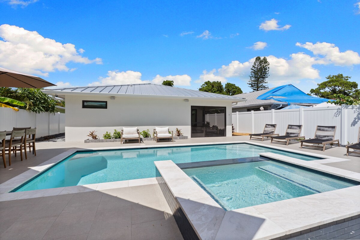 Have fun with the whole family at this stylish Naples Costal Paradise Home. Tropical Oasis within minutes to the beaches, restaurants, shopping, entertainment. Heated pool/spa no jets, Wi-Fi, big lanai with BBQ and more. House is a 3-bedroom, 2-bathrooms fully renovated in coastal contemporary style with tile floors, coastal art, big kitchen and more. King bed, queen bed, 2 full beds, big modular couch. House will comfortably sleep 6 adults plus children. It has all you need for great vacation.