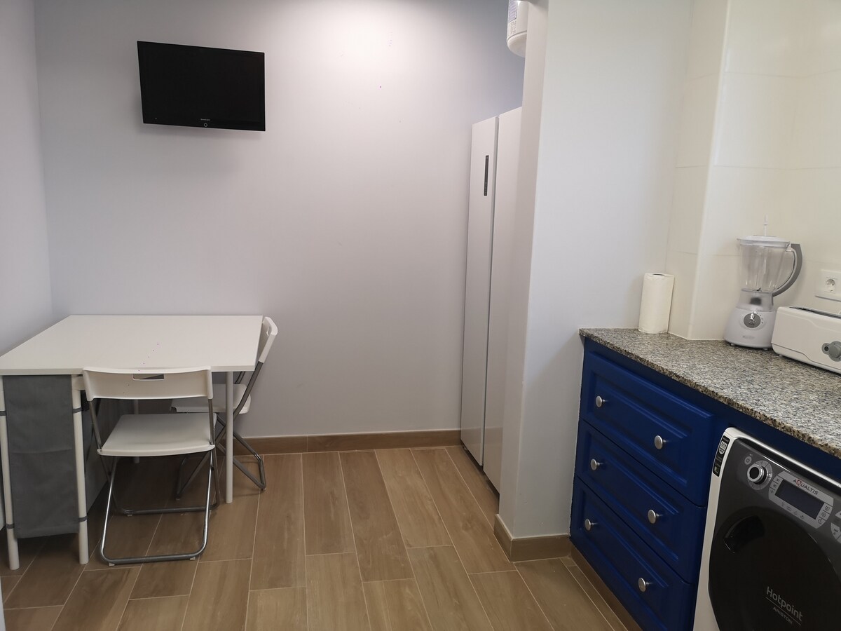 STUDIO AVEC VUE SUR L'OCÉAN, spacieux. NETTOYAGE QUOTIDIEN. Balcon exposé sud avec vue magnifique sur l'océan. Il dispose d'une cuisine équipée, d'une salle d'eau avec douche, d'un téléphone direct, d'une télévision, d'une connexion Wi-Fi GRATUITE et d'un coffre-fort à louer. 39m ². 2 lits simples sur demande, nous les convertissons en lit double de 180 cm x 200 cm. séchoir à cheveux et miroir grossissant. Amenities-Balcon-table et 2 chaises-Nevera -American Coffee Maker-Toaster-Toaster-Sols stratifiés-Télévision-Téléphone-Internet GRATUIT WI-FI- USB 5V 2400mA