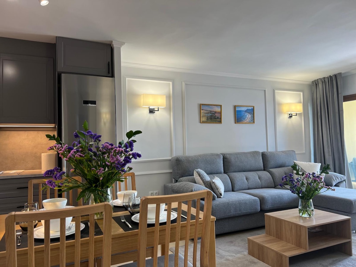 Appartement moderne, récemment rénové et spacieux avec vue sur mer. Il dispose de 2 chambres. La chambre principale a un lit double et une autre chambre dispose de deux lits simples. Le salon se compose d'un coin cuisine, coin repas et d'un canapé confortable et d'une télévision à écran plat. La cuisine est équipée d'une plaque induction, d'un lave-vaisselle, d'un four/micro-ondes, d'un grille-pain, d'un réfrigérateur et d'ustensiles de cuisine. Tous les appartements ont la terrasse avec une magnifique vue sur la mer, table et chaises.