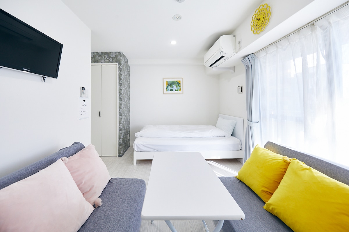 Ouverture récente en 2021 Recommandé pour la famille et le groupe d'amis. Vous pouvez profiter de la cuisine. Deux supermarchés et supérettes à distance de marche. 1 unité à chaque étage de sorte que l'étage entier est à vous. Sentez-vous comme chez vous dans cet appartement. 2 chambres, 60! 2 stations de métro sont à proximité. Vous pouvez facilement accéder à Namba, à l'aéroport et à d'autres sites touristiques. Équipé d'un projecteur. Vous pouvez accéder à Youtube, Netflix, Amazon Prime et à d'autres contenus.