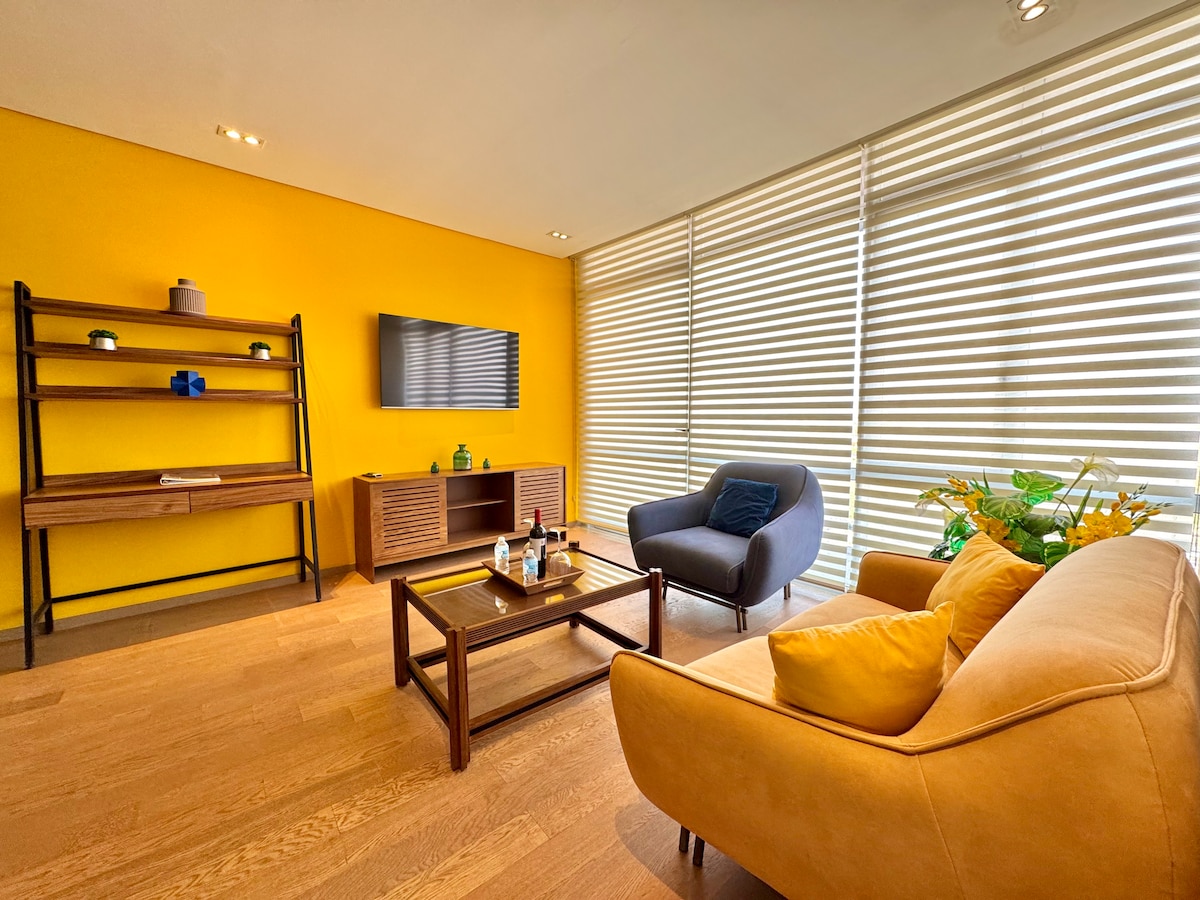 Loft de luxe avec terrasse à Sonata Towers, Lomas de Angelópolis. Comprend une chambre avec un lit double, un placard moelleux, une télévision et une salle de bain complète avec des équipements haut de gamme. Le salon comprend un canapé, un espace repas avec micro-ondes, un frigobar, une station de café et un bureau. Profitez d'un parking couvert, d'un service de voiturier et d'un service de chambre depuis le restaurant de l'immeuble. À quelques pas des boutiques, restaurants et activités culturelles du quartier de Sonata. Idéal pour les affaires ou les loisirs, avec une sécurité 24h/24 pour un séjour en toute sécurité.