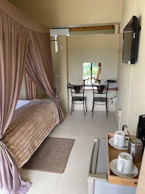 Cet endroit élégant et unique prépare le terrain pour un voyage mémorable. Chalet est un coin couchage ouvert avec lit double, 2 lits simples, salle de bain attenante et cafetière/théière. Le chalet n'est pas une unité indépendante et n'a pas de télévision/réfrigérateur.