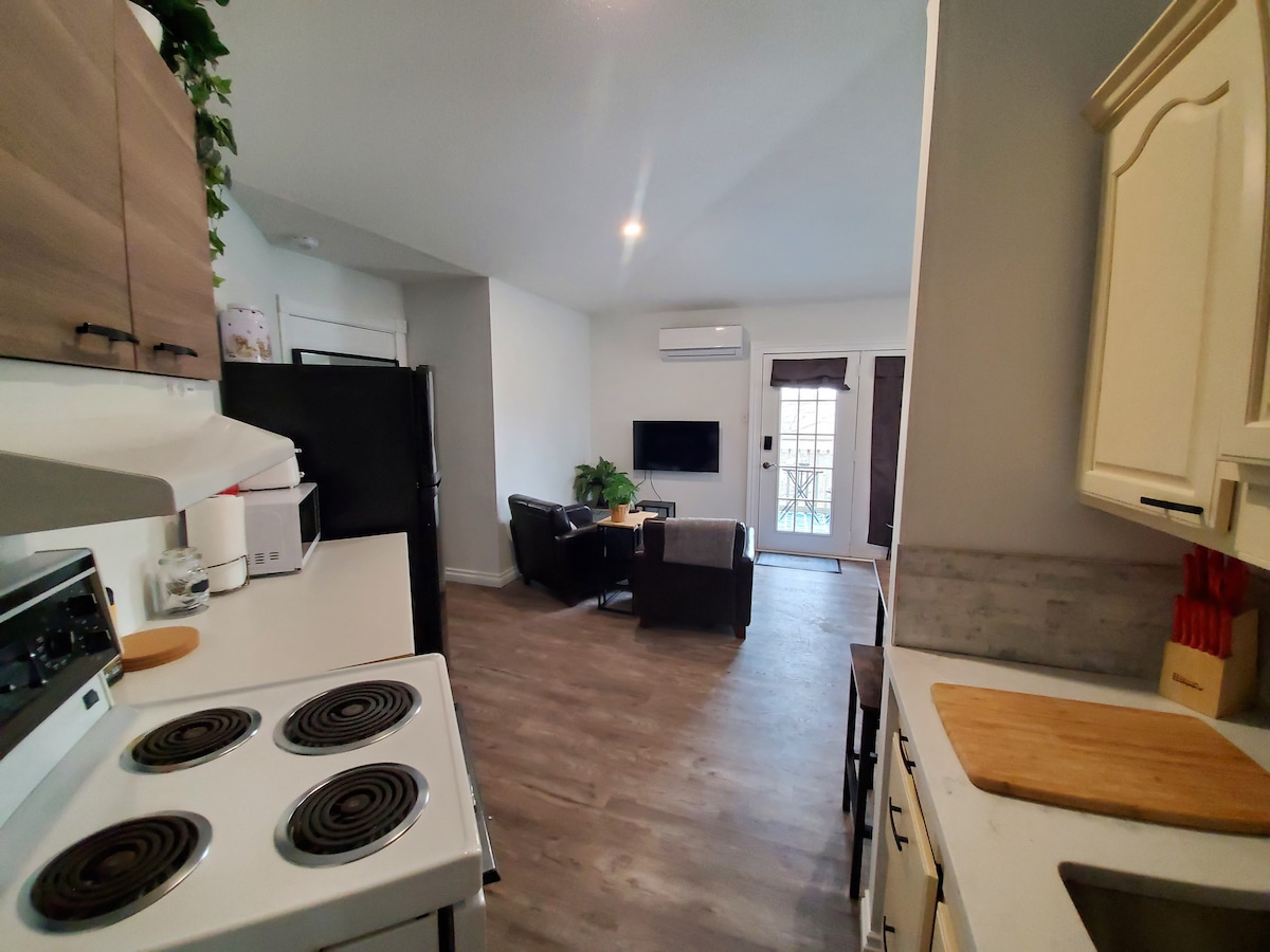 Nous avons récemment rénové notre sous-sol pour créer une suite élégante, moderne, confortable et calme. Il y a une entrée latérale qui s'ouvre directement sur les escaliers qui vous mènent à l'unité. Il dispose d'une porte extérieure métallique verrouillable pour l'insonorisation et la sécurité. Le logement est un studio lumineux avec trois grandes fenêtres, une cuisine complète, un coin salon avec télévision et cheminée, une table à manger, un lit Queen Size, un dressing et votre propre salle de bain privée avec une douche de 5 pieds. Avec une insonorisation étendue !