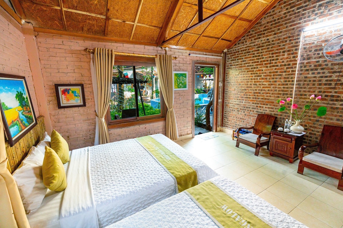 Évadez-vous dans notre charmant bungalow double à Ninh Binh Family Homestay, conçu pour le confort et la tranquillité. Cette retraite confortable offre un mélange parfait d'équipements modernes et de charme traditionnel vietnamien, ce qui en fait une escapade idéale pour les couples. Profitez de l'ambiance sereine de nos jardins luxuriants et plongez dans la piscine. Découvrez l'hospitalité chaleureuse de notre famille et explorez les attractions à proximité comme Bai Dinh, Trang An, Hang Mua, Tam Coc, Hoa Lu Ancient Capital et le parc Cuc Phuong.