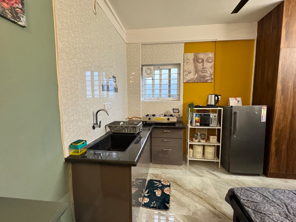 Bienvenue à Fortale Prime ! Profitez d'une vie moderne dans notre studio non-fumeur nouvellement construit, offrant une chambre privée et un salon, une cuisine entièrement équipée, une salle de bain et un balcon. Il s'agit d'un logement non climatisé REMARQUE : c'est au rez-de-chaussée. Nous sommes situés à JP Nagar, à seulement 5 minutes de BG Road et IIM BLR Détendez-vous sur la terrasse commune avec des robinets d'eau potable RO à chaque étage. notre propriété assure un séjour confortable pour les séjours courte et longue durée. Au plaisir de vous accueillir !