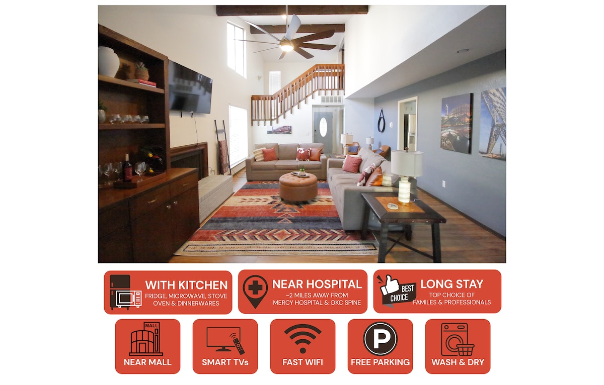 Tout le groupe bénéficiera d'un accès facile à tout depuis ce logement central. Il a été récemment rénové avec des meubles, des appareils électroménagers et des salles de bain neufs. Il se trouve à seulement quelques minutes de Top Golf, Main Event, Quail Springs Mall, et BIEN PLUS ENCORE ! Il dispose d'un patio extérieur pour en profiter, ainsi que d'une cheminée intérieure. Il y a également une télévision intelligente avec des capacités de streaming et un garage avec un abri contre les tempêtes. 1,7 mi Quail Springs Mall À 12 miles de OKC Fairgrounds À 18 miles de l'aéroport Will Rogers