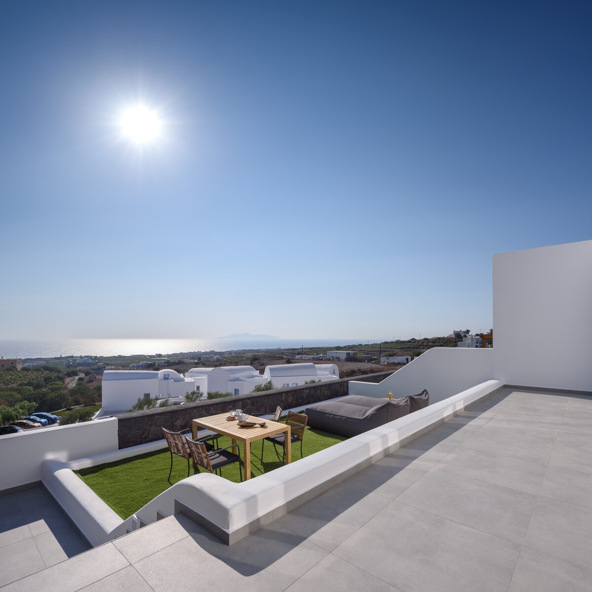 This luxury suite consists of an open plan bedroom with king size bed and spacious living room, a bathroom with rain shower and a fully equipped kitchenette with small fridge. This refined decorated apartment can accommodate up to four people looking to relax in beautiful surroundings, as it opens to a sensational private terrace with a heated cave mini pool that both provide caldera and sea view.