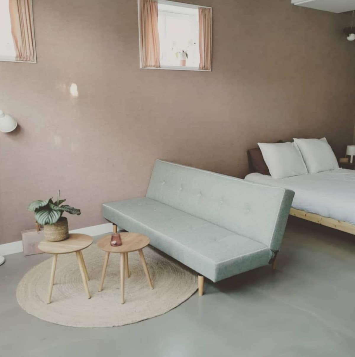 Cette charmante propriété a une décoration élégante. Équipé avec tout le confort ! Vous cuisinez ou préparez votre propre petit-déjeuner ? Vous pouvez le faire dans votre propre cuisine. Vous préférez un petit déjeuner ? Nous pouvons le préparer pour vous ( € 12.50 p.p.) Une entrée privée, une salle de bain privée, une cuisine privée, un canapé-lit (3e pers), un siège et un coin repas. Vous pouvez donc séjourner seul dans notre studio.