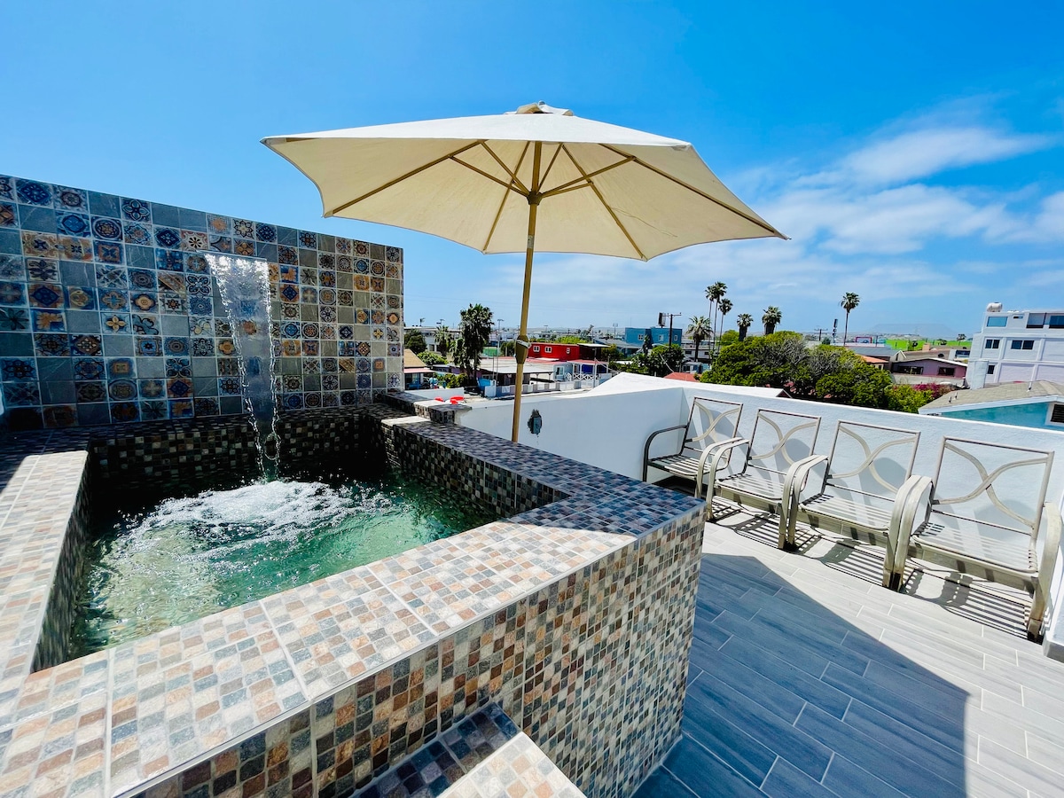 Bienvenue dans votre retraite à Rosarito ! Évadez-vous sur la côte et imprégnez-vous du style de vie de Baja à la Casa de las Olas, une élégante maison de plage de 3 chambres et 3 salles de bain, à quelques pas de l'océan et des restaurants animés de Rosarito. Que vous soyez là pour le soleil, le surf ou la détente pure, cette escapade spacieuse a tout ce qu'il faut pour vous détendre dans le confort. Mais la vraie magie se produit à l'étage : votre terrasse privée sur le toit est un véritable spectacle. Détendez-vous dans votre piscine privée !