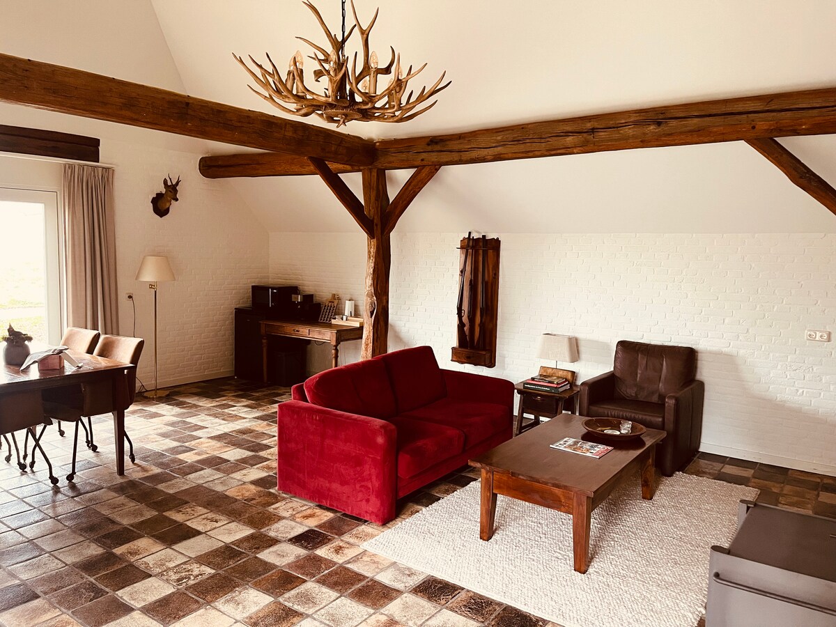 Profitez de cette écurie entièrement rénovée avec des éléments modernes ,mais aussi nostalgiques. L'espace dégage une atmosphère agréable et calme à travers son environnement rural, mais aussi le sentiment d'avoir son propre logement privé. Belle terrasse ( éclairée) où vous pourrez manger à la table de pique-nique et prendre votre verre dans les chaises confortables donnant sur l'étang à chèvres. Une piscine avec des chaises longues que vous pouvez utiliser (bien sûr à vos propres risques). D'un sauna finlandais : Sur demande pour 15 euros.