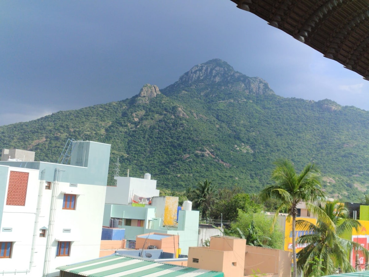 Votre merveilleux séjour à seulement 500 m de Ramana Ashram et 600 m de Yogi Ram Ashram. Un studio spacieux avec tous les besoins de base, réfrigérateur, Wi-Fi gratuit, parking gratuit. Un balcon avec vue sur Arunachala. La maison peut accueillir 2 adultes et 1 enfant. Le temple Arunachaleswarar est situé à seulement 2 km. De bons restaurants et cafés sont accessibles à pied. Vous serez proche de tout en séjournant dans ce logement situé au centre.