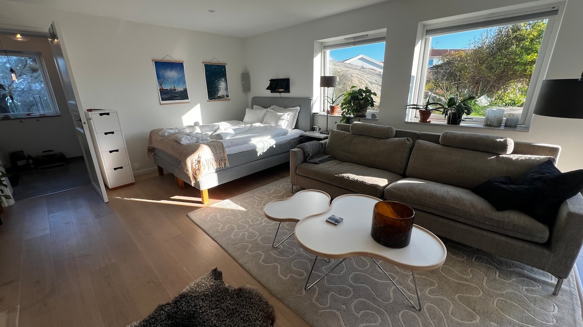 Cozy cottage in very nice area right by the sea. Quiet and nice with sun all day. Lovely large patio with larger table and BBQ for wining and dining. In addition, own private terrace with deck chairs. Only 2 minutes walk to tram taking you directly into town in 20 minutes. Or take the tram 2 stops to nearby Saltholmen and take the ferries to the lovely southern archipelago.