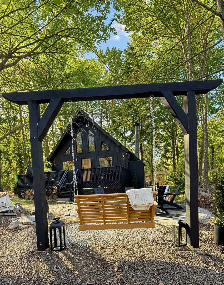 Cabane moderne et sereine avec foyer